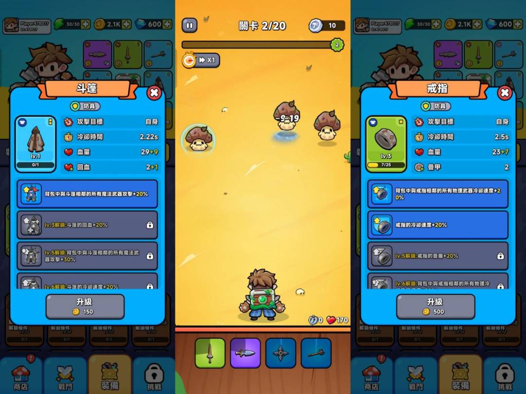 When looking at the quality of a game, the art is often the most direct. Weapon Master: Backpack Battle” uses a bright painting style similar to that of ‘Heroes of Hop Hop’ in its art style, with a cartoonish character design and excellent art details, such as the use of a large number of contrasting colors to create a sense of hierarchy, and the design and layout of the size of different icons and text to make the UI interface simple and clear.