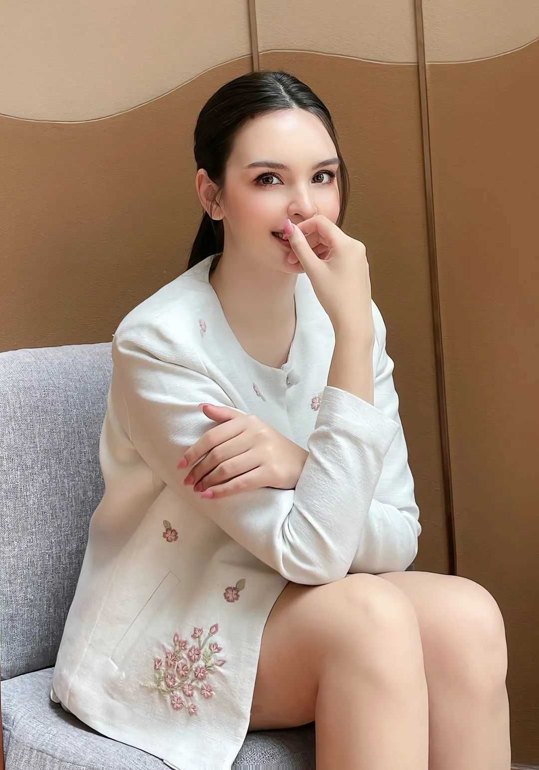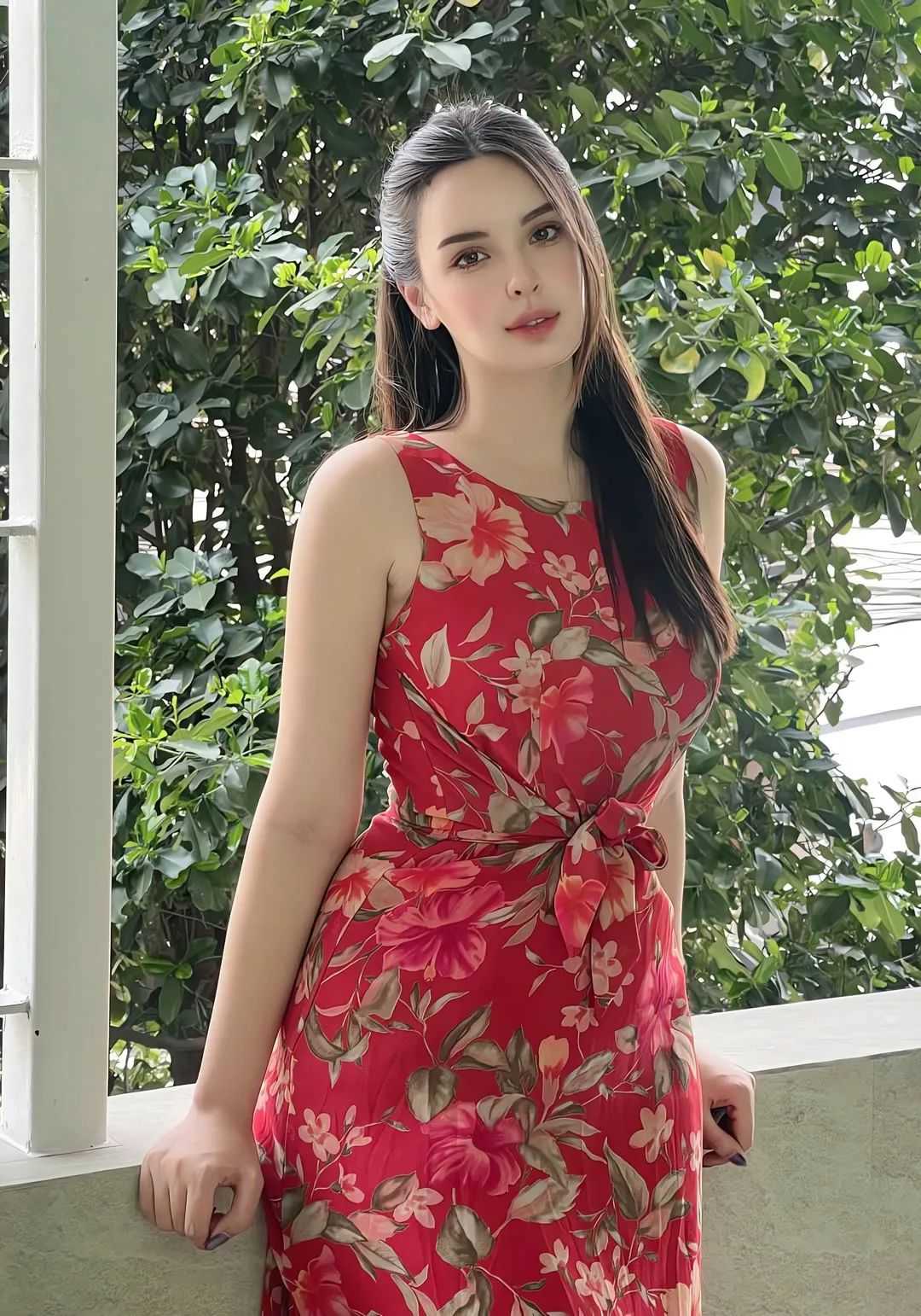 In a vibrant street market, the model pauses to examine colorful textiles, her casual denim jacket and sneakers contrasting with the vivid stalls around her. The chaos of the market fades into a blur as the camera focuses on her intrigued expression, a snapshot of curiosity in motion. Later, she poses on a concrete rooftop at dusk, the city skyline glowing behind her. Dressed in a minimalist black dress, she leans against a metal railing, her gaze distant yet anchored in the moment—a study in contrast between soft femininity and the city’s hard edges.